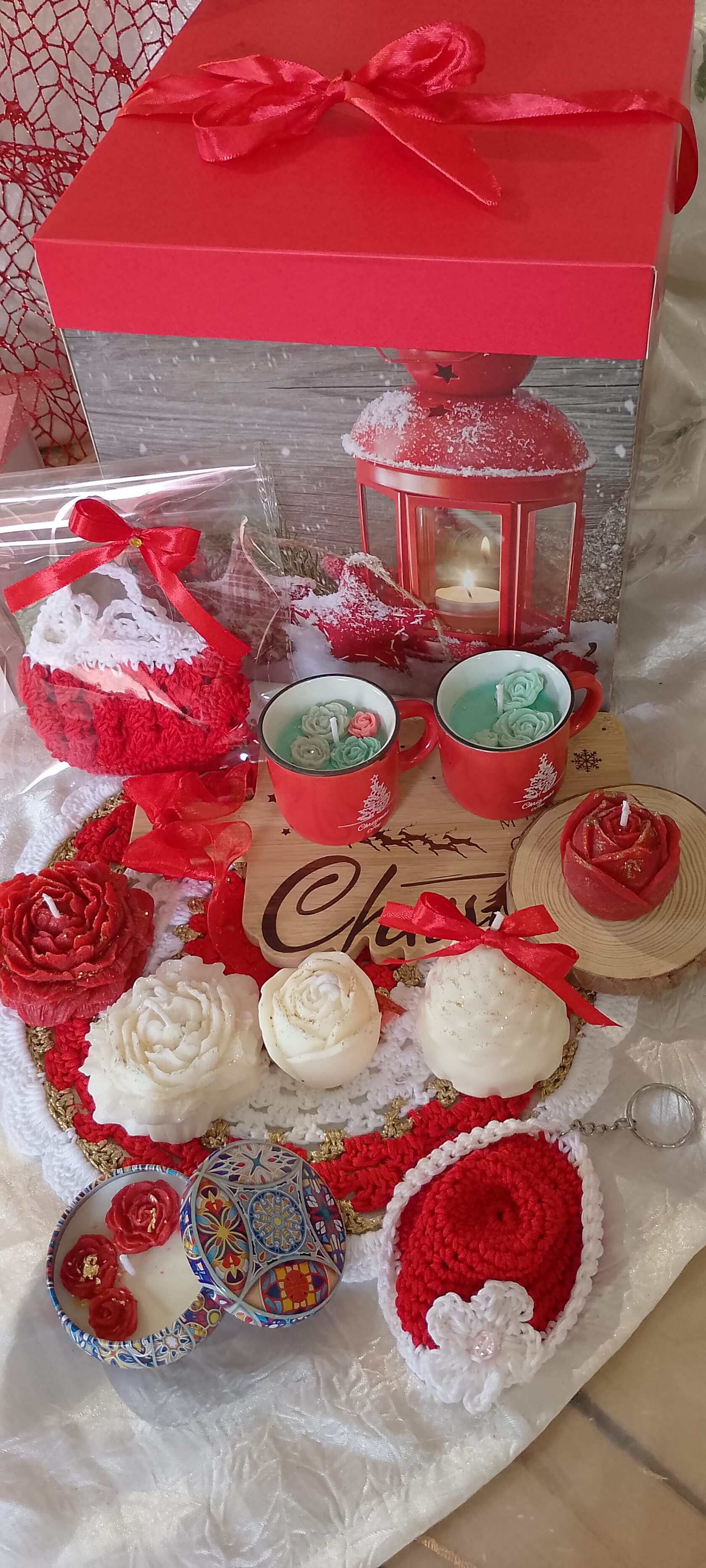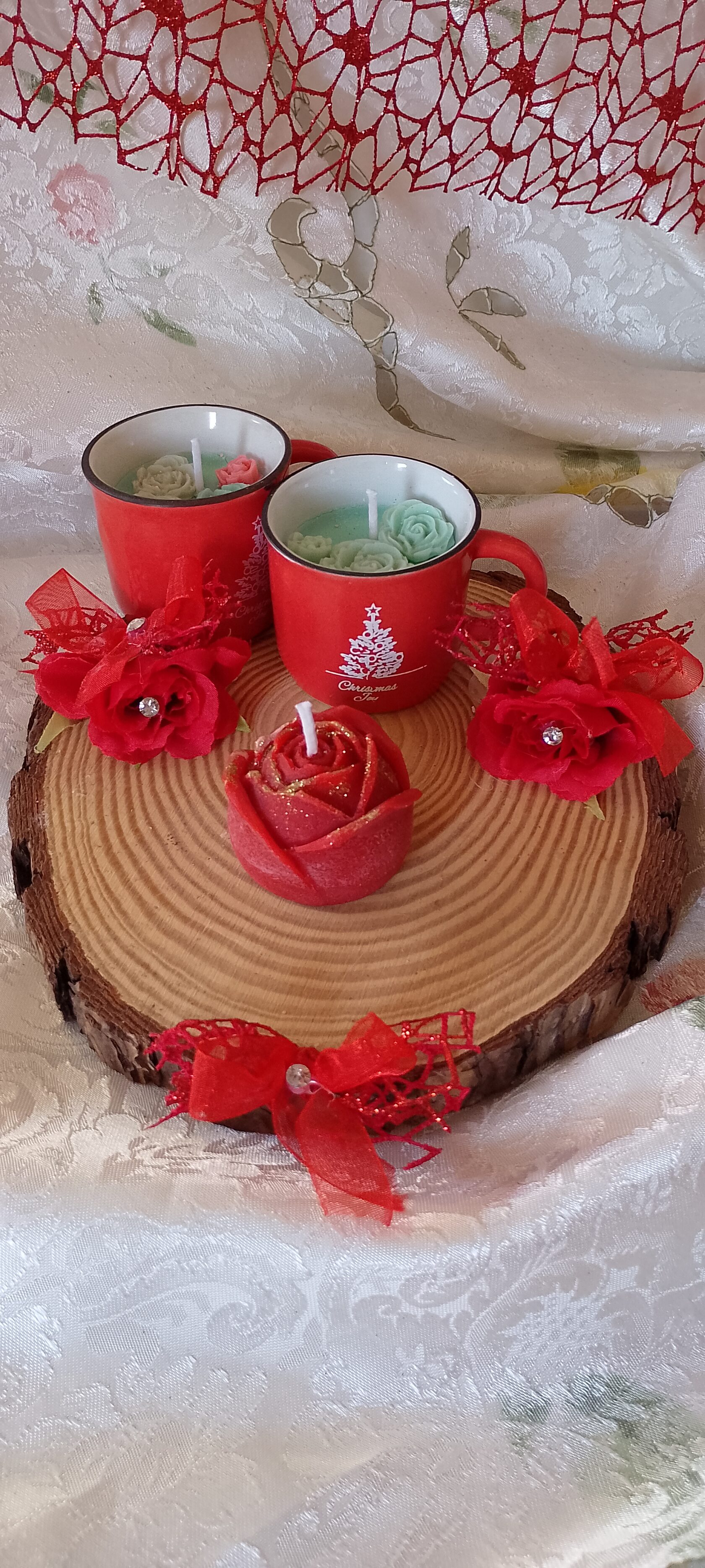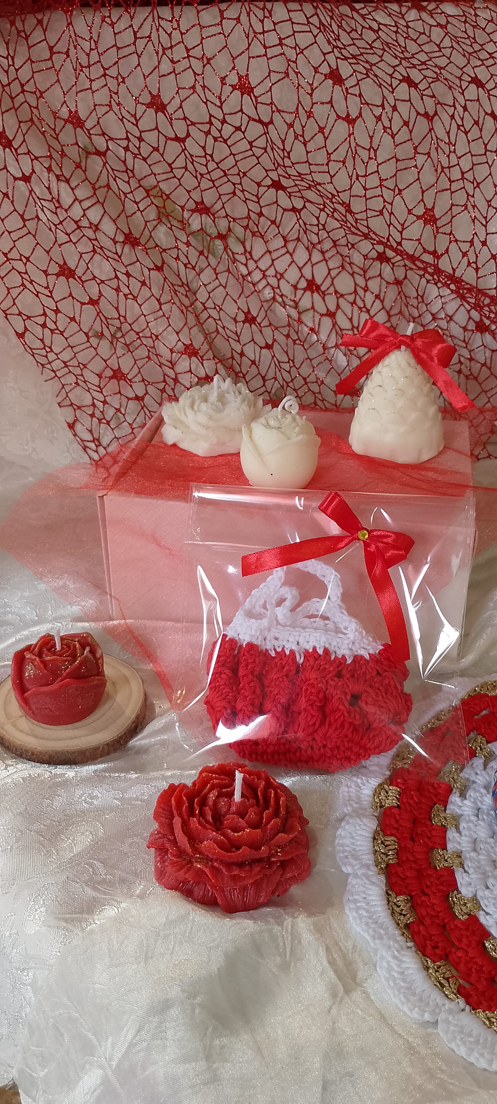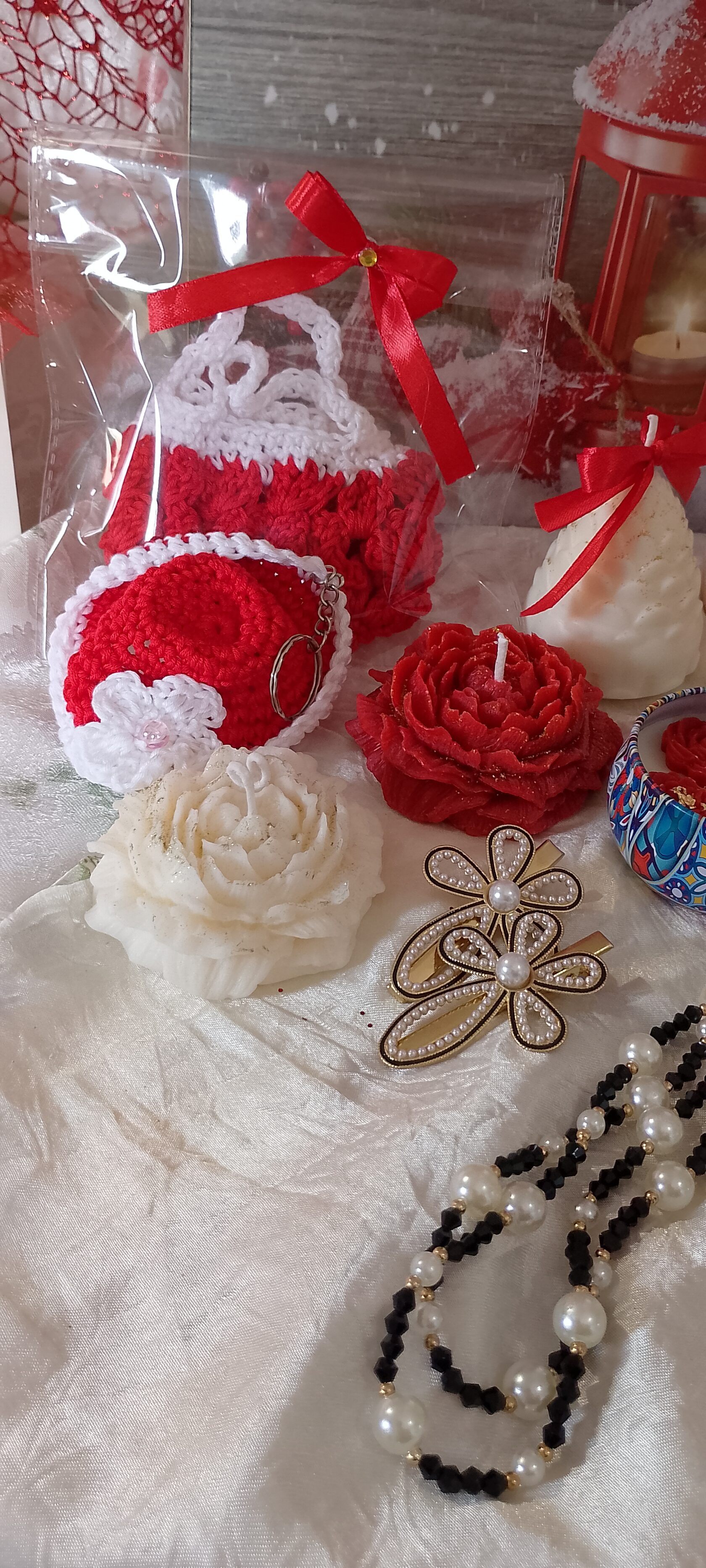2CANDELE PEONIA 1 TAGLIERE CON DUE CANDELE IN TAZZINA 1 CANDELA PETALI DI ROSA 1CANDELA PETALI DI ROSA CON TRONCHETTO. 1 CANDELA PIGNA. 1 CANDELA IN CONTENITORE. 1 PORTACHIAVI LAVORATO ALL UNCINETTO 1 BORSETTINA PORTA CANDELA 1 CENTRO SOTTOPIATTO LAVORATO ALL UNCINETTO